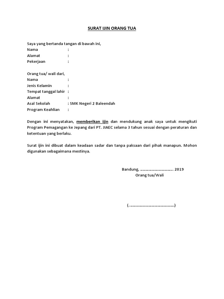Perlu dipahami sebelumnya bahwa surat izin orang tua dapat digunakan untuk berbagai keperluan, seperti kerja, sekolah, kuliah, kegiatan organisasi, dan masih. Jadi contohnya jika anda yang sakit, maka bisa dibuatkan oleh orang tua, saudara. Jika dalam artikel sebelumnya kita membahas contoh pemberitahuan aktivitas resmi, dalam artikel ini kita akan membahas contoh surat izin or. Kumpulan contoh 'surat izin orangtua' dalam bahasa inggris beserta artinya lengkap.