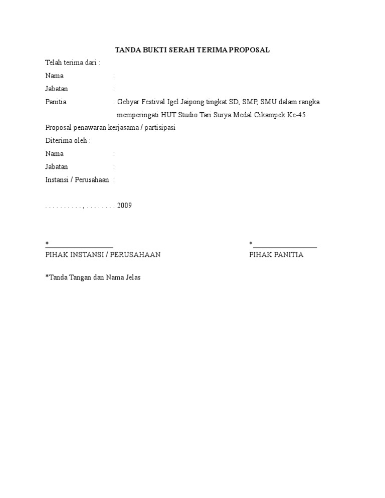 Surat ini sebaiknya segera dibubuhkan tanda tangan ketika ada prosesi penyerahan suatu barang dari satu pihak ke pihak lain. Berita acara pembagian raport dan daftar serah terima katulis. Dalam kegiatan ini biasanya dilakukan oleh sebuah toko yang ingin serah terima kepada pihak lain atau pihak kedua. Bukti penerimaan sudah terima dari :