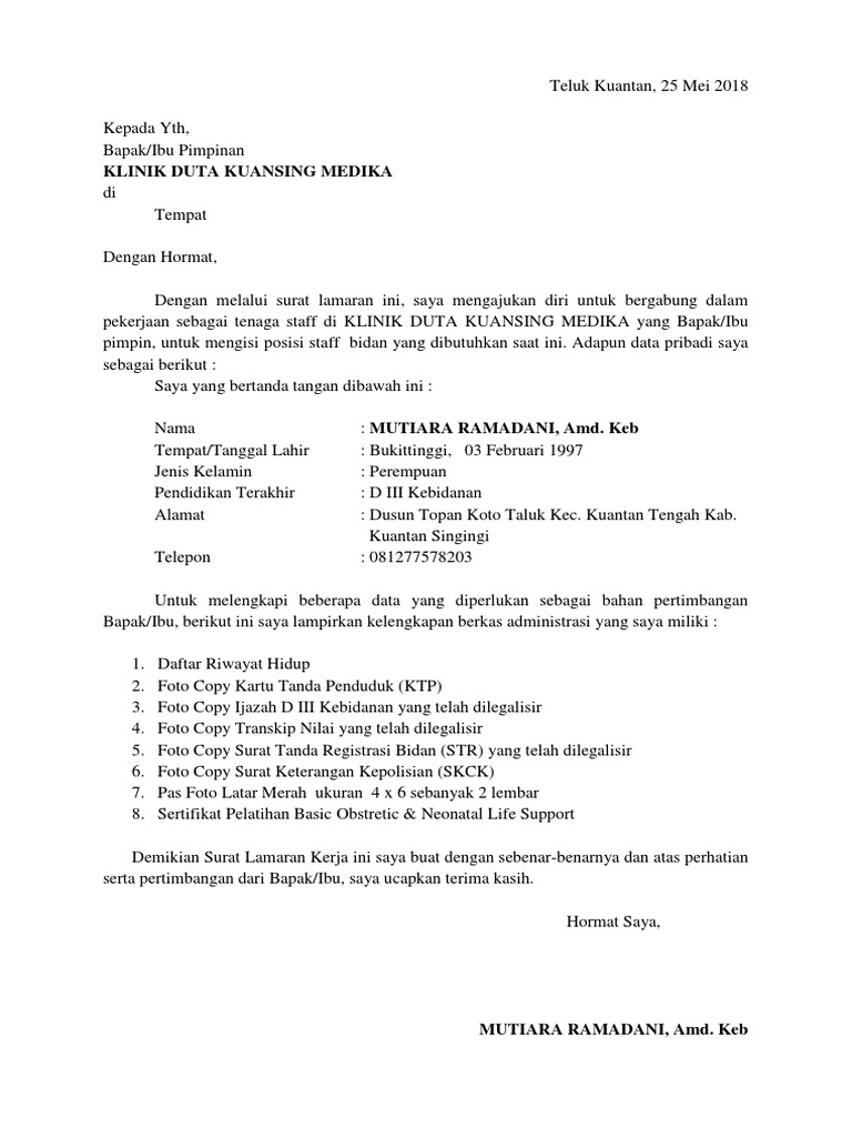 20+ Contoh Surat Lamaran Kerja Bidan. Pengertian surat lamaran kerja bidan. Akan tetapi, terkadang kita luput bahwa hal yang esensial bukan hanya soal ketertarikan kita pada pekerjaan yang dilamar tersebut.