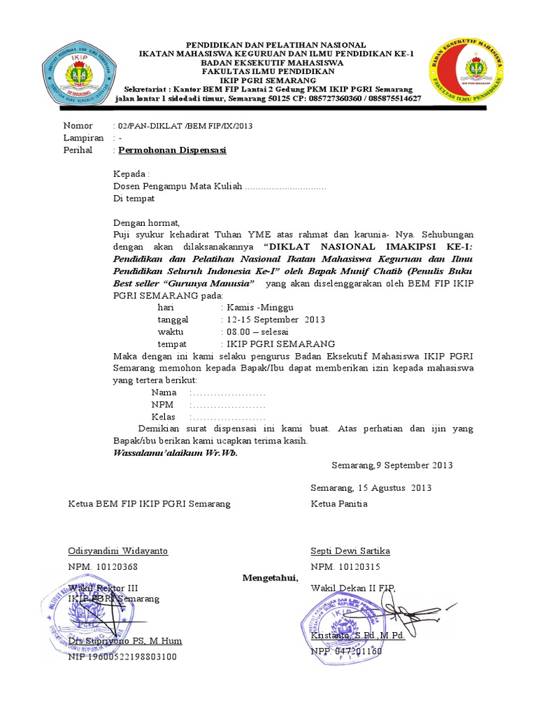 25+ Contoh Surat Dispensasi. Surat dispensasi sendiri digunakan untuk berbagai macam urusan. Contoh surat dispensasi tidak masuk kuliah.