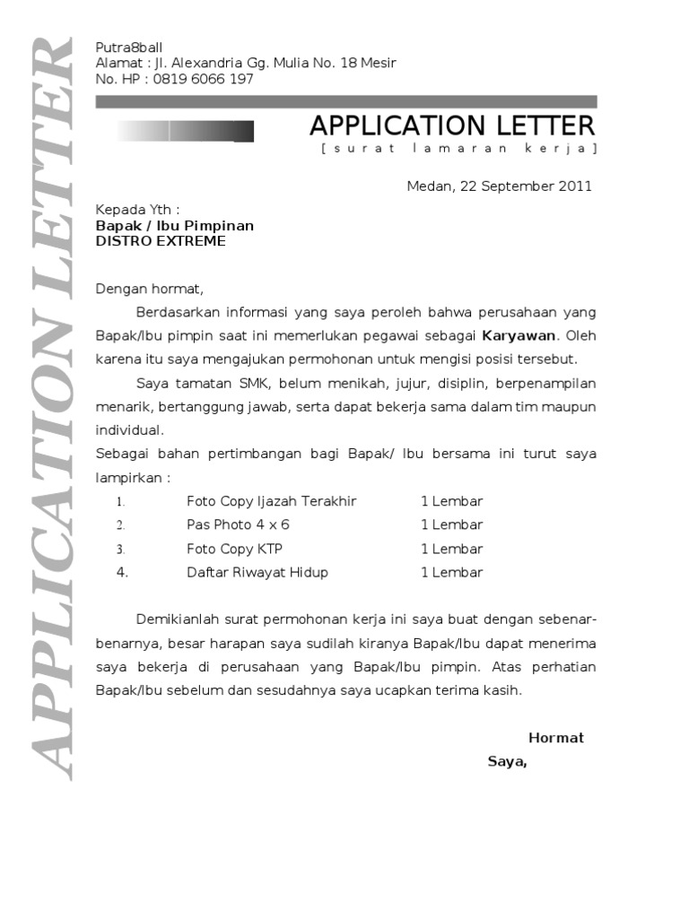 Jika kamu masih bingung harus membuat seperti apa.kamu bisa menggunakan contoh surat lamaran kerja tesebut sebagai acuan untuk membuat surat lamaran pekerjaan yang paling cocok. Secara umum, setelah kalian memiliki gelar baik itu d3 ataupun s1 pasti ingin sekali bukan untuk memberikan suatu hal yang terbaik untuk orang tua? Sebelum membuat surat lamaran yang baik ada hal penting yang harus kamu ketahui sebelumnya agar surat lamaran kerja kamu bisa dipahami dengan baik dan supaya. Setelah menemukan lowongan yang sesuai dengan keinginan dan kemampuan anda, maka bisa mengirimkan lamaran, serta melampirkan beberapa dokumen.