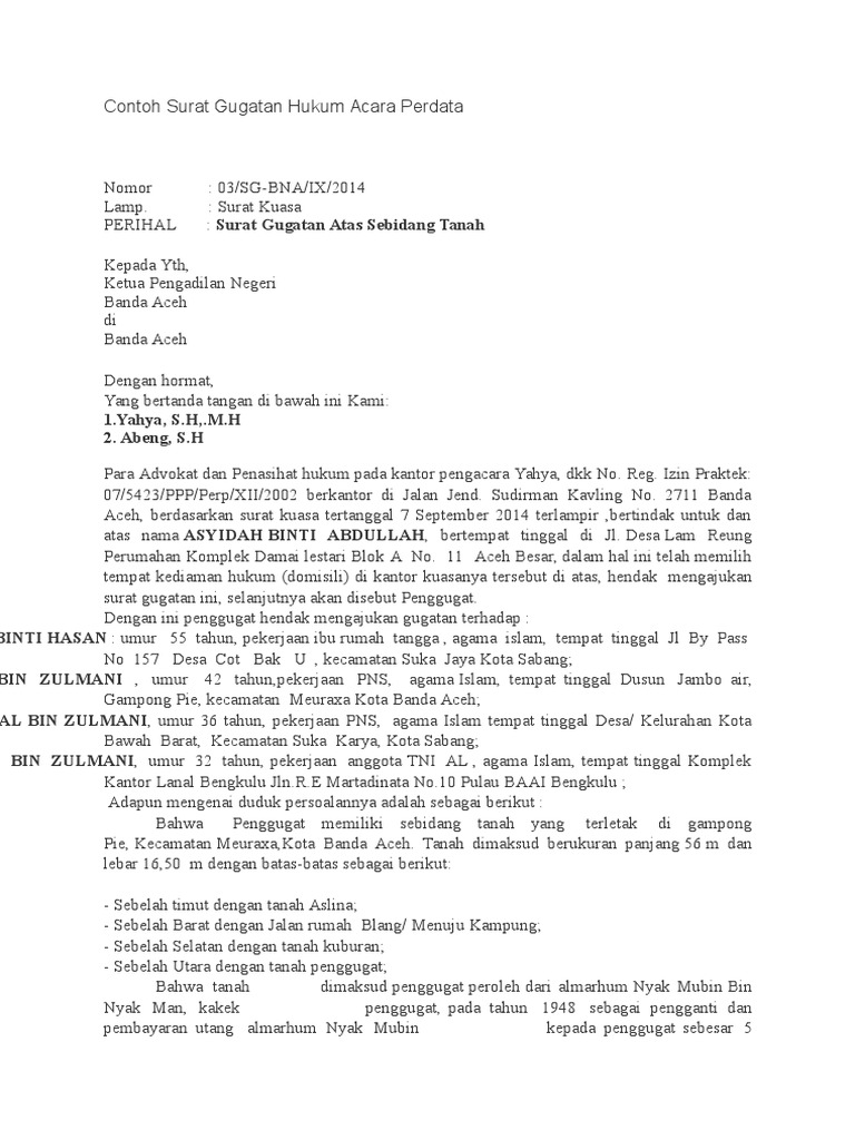 11+ Contoh Surat Gugatan Tanah. Surat gugatan sengketa tanah dibutuhkan dalam masalah sengketa tanah yang terjadi karena dengan adanya surat maka gugatan dianggap formal dan atau resmi. Ya, hal ini dilakukan demi kelancaran transaksi supaya dijauhkan dari.