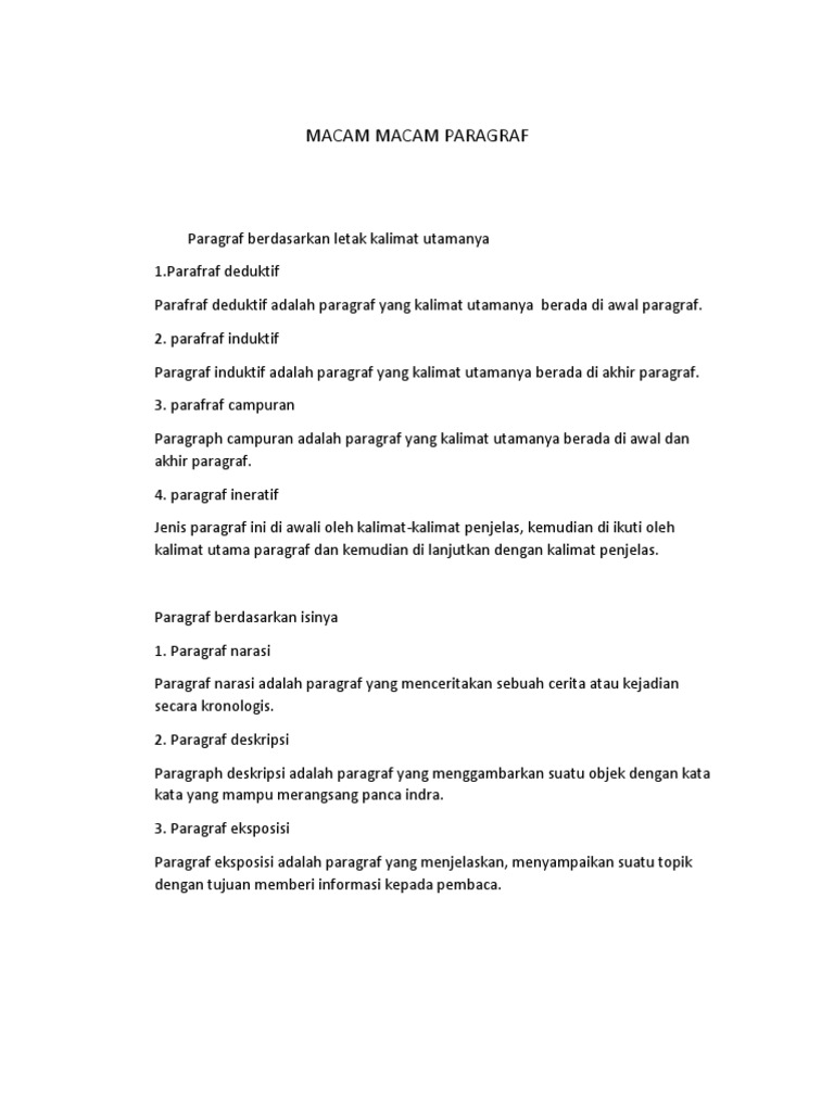 Paragraf tentunya terdapat di setiap jenis tulisan baik cetak maupun elektronik. Narasi adalah paragraf yang menceritakan suatu kejadian atau peristiwa. Paragraf terdiri dari dua jenis kalimat. Artikel makalah membahas tentang macam macam paragraf beserta pengertian dan contohnya dan berdasarkan letak kalimat utama supaya mudah di pahami.