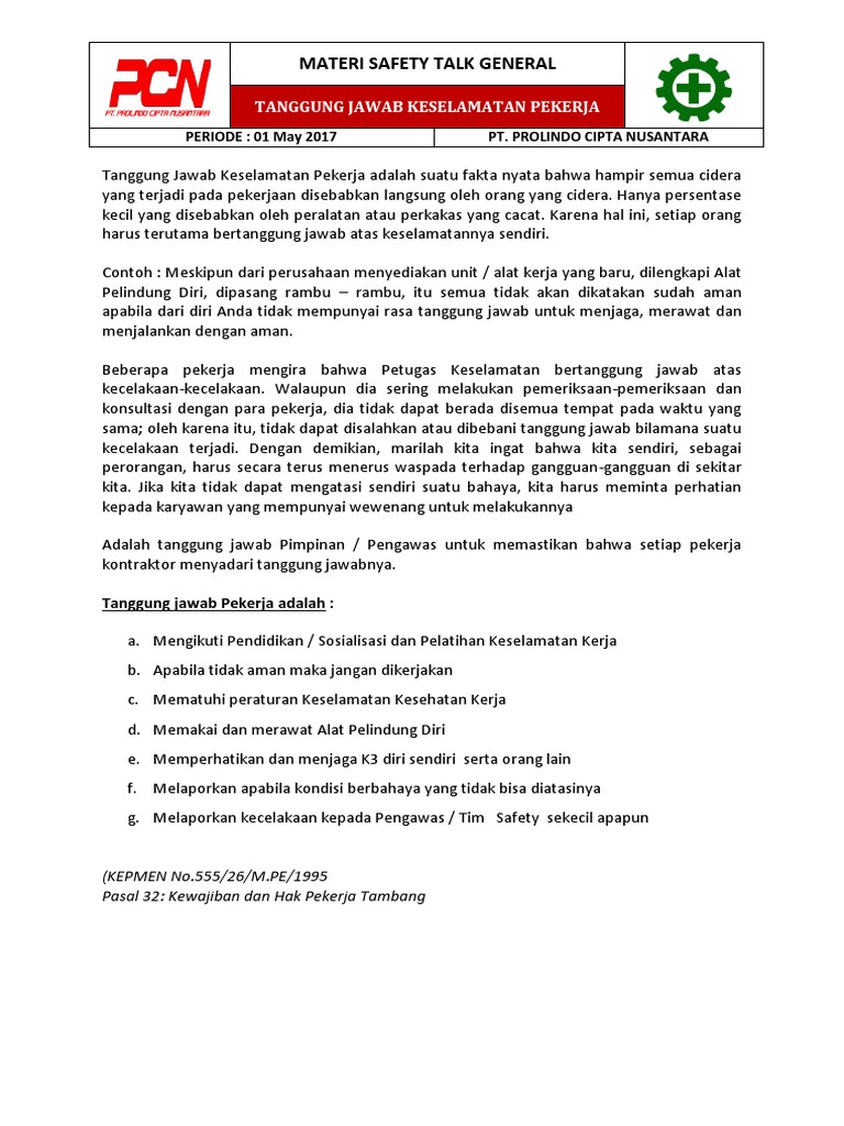 Materi Safety Talk General Pt Pcn Periode May 2017 from imgv2-2-f.scribdassets.com Bahan materi safety talk mengenai hse golden rules di pertamina , alasannya tema tersebut sangat berkenaan pada peraturan kesehatan dan kese. Agus wahyudi editor materi : Pesan saat safety talk tidak ada standar pesan untuk safety talk.