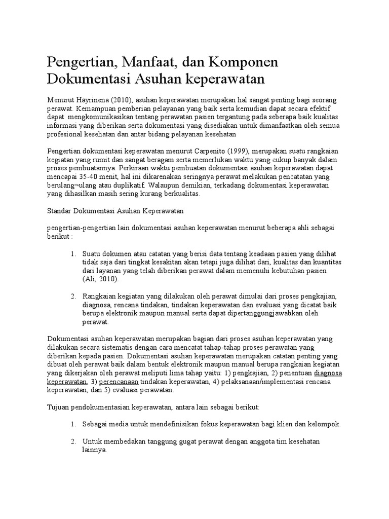 Tahapan dokumentasi tersebut diantaranya adalah Pengertian dokumentasi keperawatan elektronik adalah suatu modul keperawatan yang dikombinasikan dengan sistem komputer yang ada di rumah sakit ke staff perawat. Demikian penjelasan materi tentang dokumentasi adalah: Pengertian dokumen menurut kamus umum bahasa indonesia, adalah sesuatu yang tertulis atau tercetak yang dapat dipergunakan sebagai bukti atau keterangan.