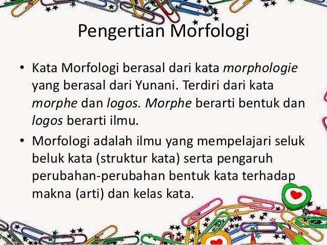 Fokus kajian yang dibahas pada pertemuan kedua ini adalah pada definisi morfologi dan kata. Jika organisme tidak bisa beradaptasi, maka. Pengertian dan latar belakang morfologi tumbuhan. Pengertian morfologi • definisi morfologi adalah ilmu yang mempelajari seluk beluk bentuk kata serta fungsi perubahanperubahan bentuk kata itu, baik fungsi gramatik maupun fungsi semantik.