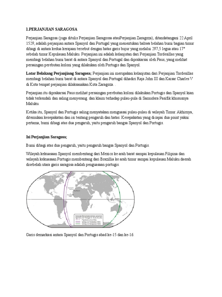 Perjanjian saragosa atau yang juga dikenal dengan perjanjian saragoza, merupakan sebuah perjanjian antara portugis dan spanyol untuk sebelumnya, kedua negara tersebut telah terikat perjanjian tordesillas yang menyepakati pembagian dunia menjadi dua yaitu bagian timur dan. Bagaimana sejarah perjanjian saragosa itu? Perjanjian tordesillas meruapakan sebuah perjanjian antara portugis dan spanyol yang merupakan pelopor penjelajahan eropa mengelilingi samudera kemudian, muncul juga sebuah perjanjian yang dinamakan perjanjian saragosa, yang ditandatangani pada 22 april 1529, secara lebih tepat. Assalamu'alikum kawan semua,, sekarang kita akan membahas perjanjian tordesillas dan sargosa.hal inilah yang mempelopori penjelajahan samudera oleh bangsa eropa.hal ini juga membuktikan belum adanya.