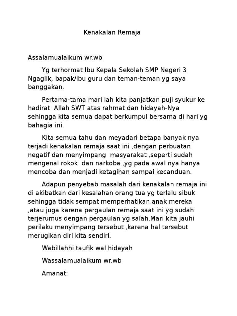 Pidato Singkat Tentang Kenakalan Remaja Masa Kini Pidatoyuk from 1.bp.blogspot.com Pidato tentang kenakalan remaja, silahkan mengeditnya sesuai dengan kebutuhan kalian. Pada kesempatan kali ini saya akan menyampaikan pidato yang bertemakan tentang kenakalan dikalangan remaja dewasa ini. Penyebab kenakalan remaja ini kebanyakan berasal dari orang tua yang terlalu sibuk dalam bekerja hingga tidak punya waktu sedikitpun untuk memperhatikan perkembangan pergaulan anak mereka.