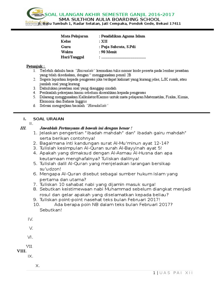 Soal Agama Kelas 12. Bisa menerima agama tanpa adanya batasan c. Berikut dibawah ini, soal uts/pai kelas 12 semester ganjil kutilas dilengkapi kunci jawaban yang berisikan soal tentang hari akhir serta qada dan kadar dengan pertanyaan dimulai dari nomor 1.