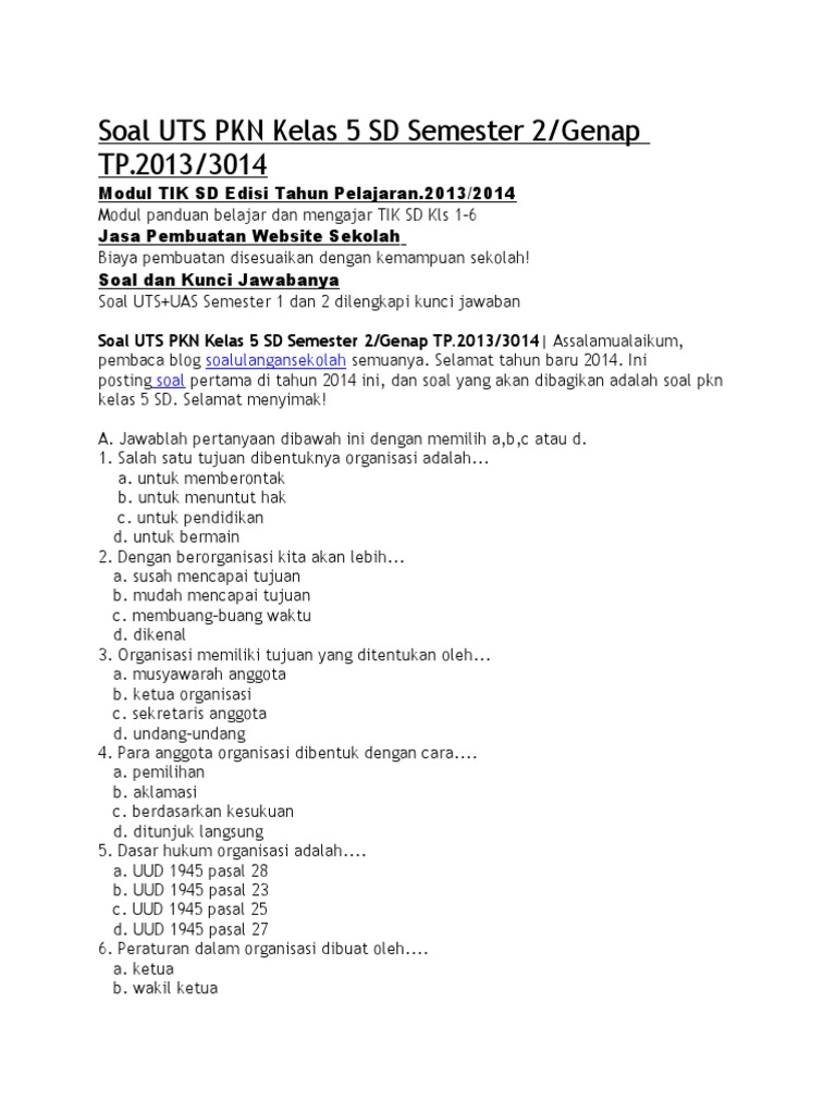 Berikut ini adalah contoh soal uts pkn kelas 5 semester 1 terbaru tahun ajaran 2018/2019. Download file dalam format.docx microsoft word dan pdf. Atau sebagai sumber referensi membuat soal. Pada kesempatan ini ppkn.co.id akan memberikan ulasan mengenai soal pkn kelas 6 semester …