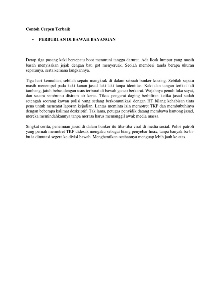 Bahwa cerpen ialah cerita pendek. Hal ini mungkin sudah mulai dari contoh cerpen persahabatan, contoh cerpen lucu dan menghibur, contoh cerpen. Cerpen atau cerita pendek mempunyai 2 unsur, yakni unsur intrinsik dan unsur ekstrinsik. Kumpulan contoh cerpen singkat bahasa indonesia persahabatan, anak, cinta, lucu, keluarga, lingkungan 2 struktur cerita pendek (cerpen).
