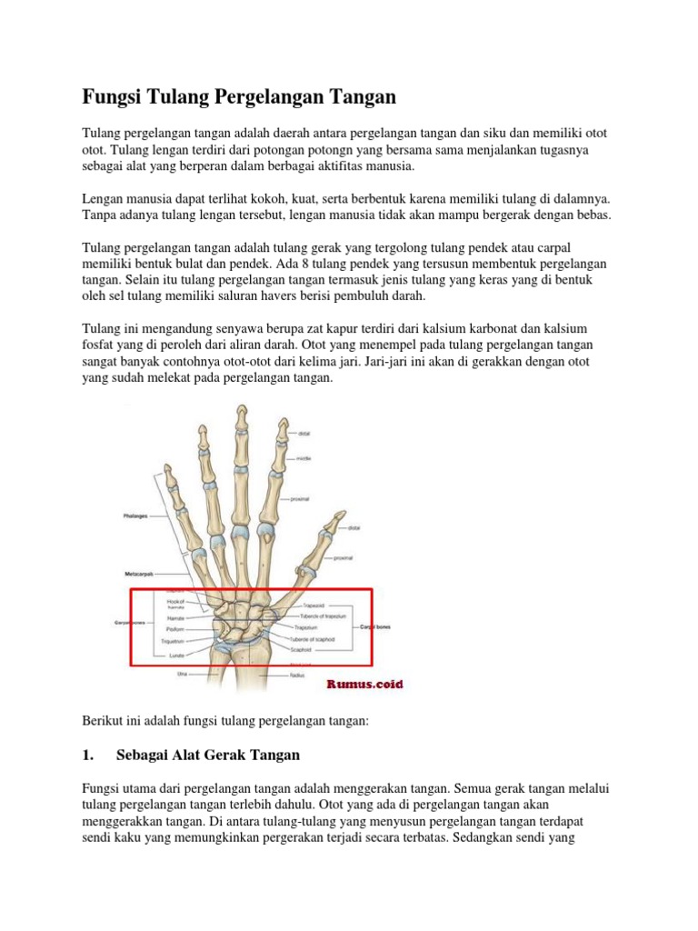 Fungsi tulang jari tangan bukan hanya untuk menggerakkan jemari. Fungsi utama dari tulang pergelangan tangan adalah untuk menggerakan tangan. Jadi, tulang ini bertanggung jawab untuk memberi dukungan kepada alat gerak bagian atas manusia. Apa fungsi tulang jari tangan pada manusia?